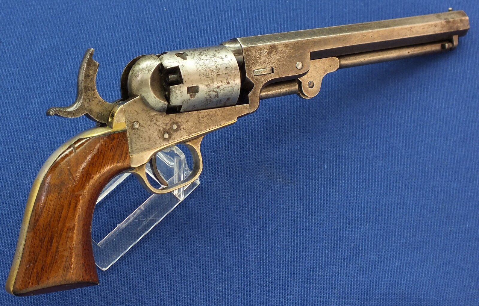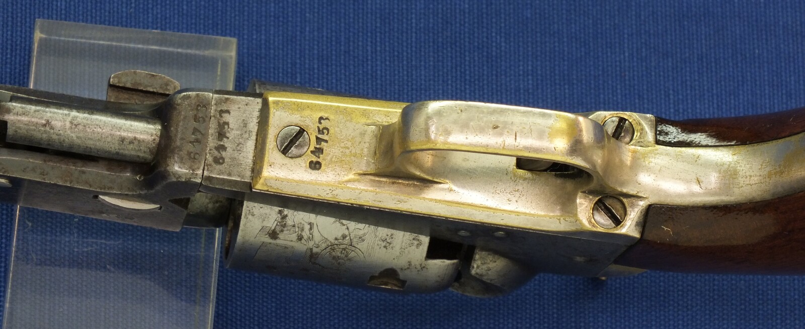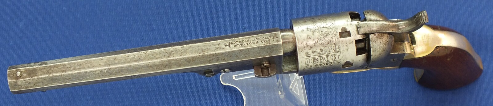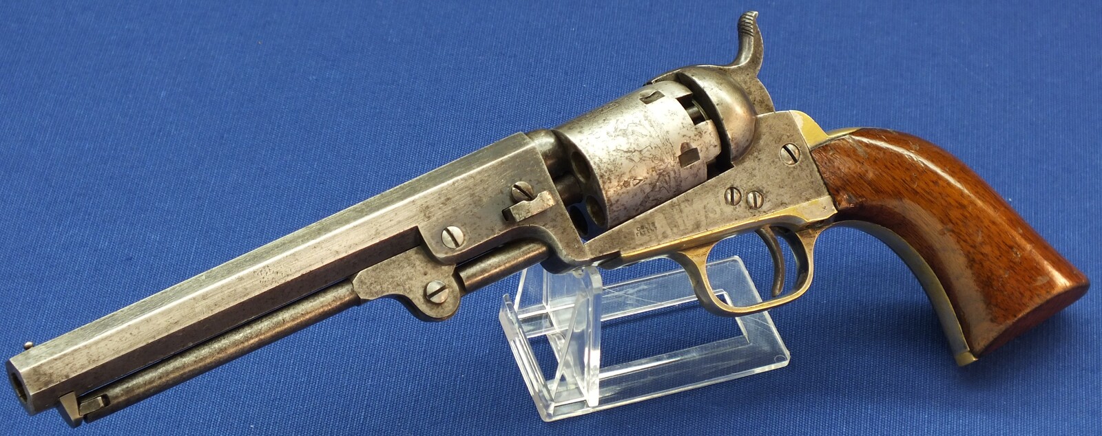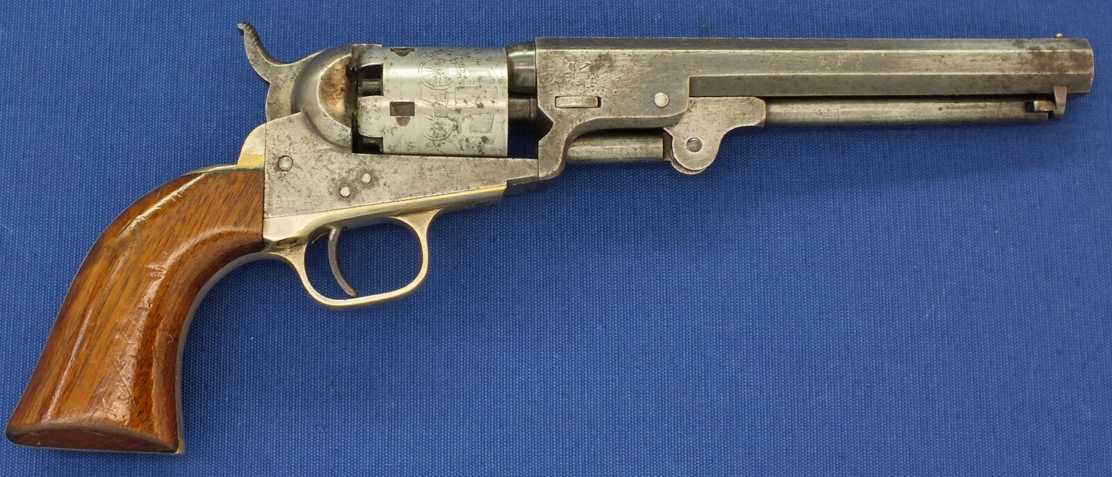 SN64753 all matching numbers made 1853. Rest of original blue. Fine and clear cylinder scene. On cylinder and barrel a crowned V. Fine grip in original finish.