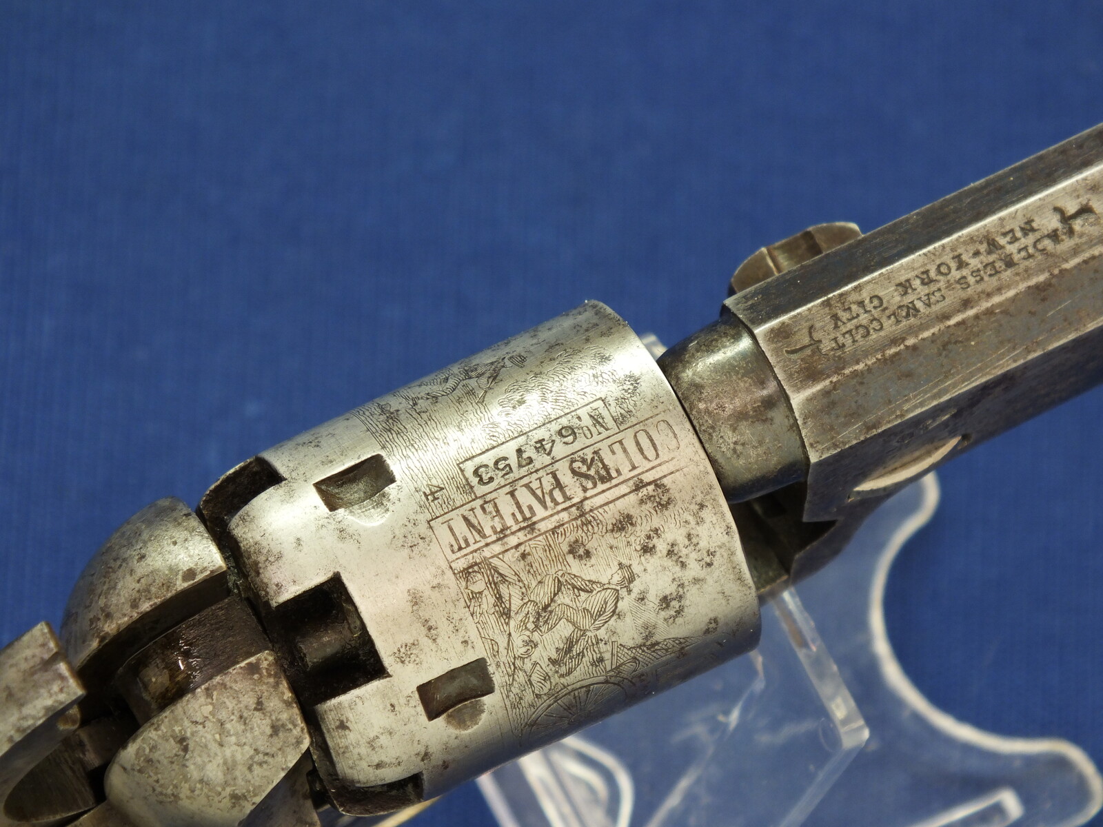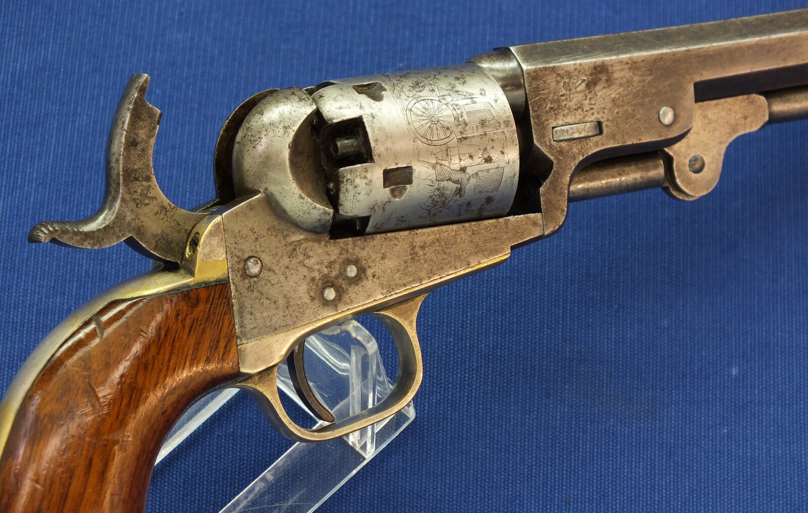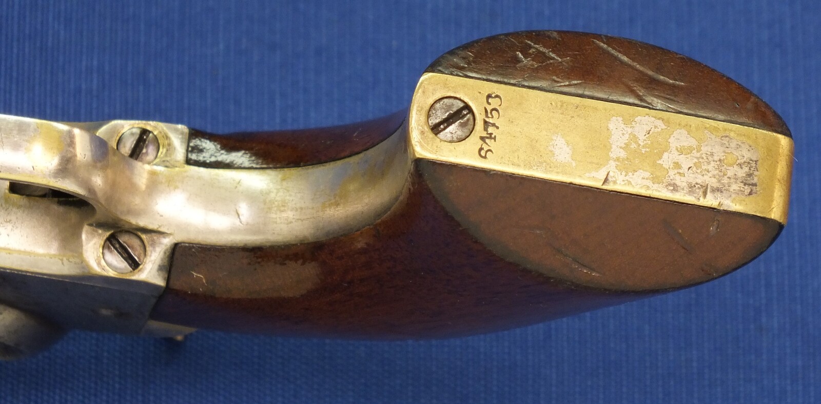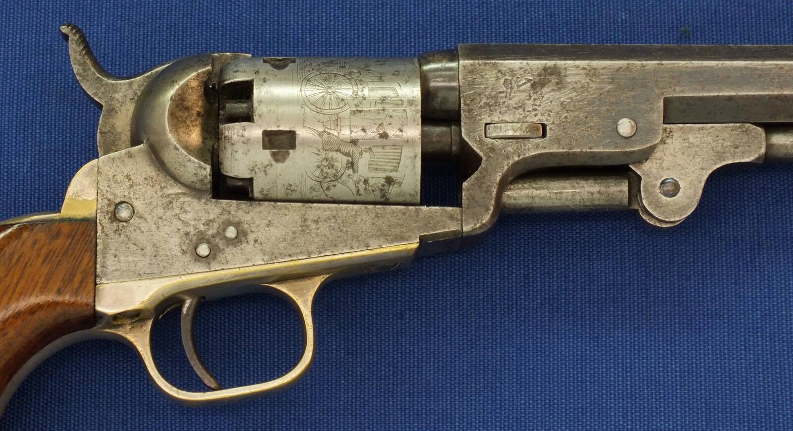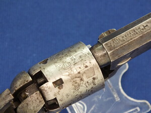 SN64753 all matching numbers made 1853. Rest of original blue. Fine and clear cylinder scene. On cylinder and barrel a crowned V. Fine grip in original finish.