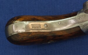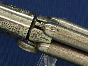 A fine antique 19th century engraved Belgian Liege 4 shot underhammer Mariette Brevete percussion Pepperbox. Caliber 9mm, length 19cm. In very good condition.