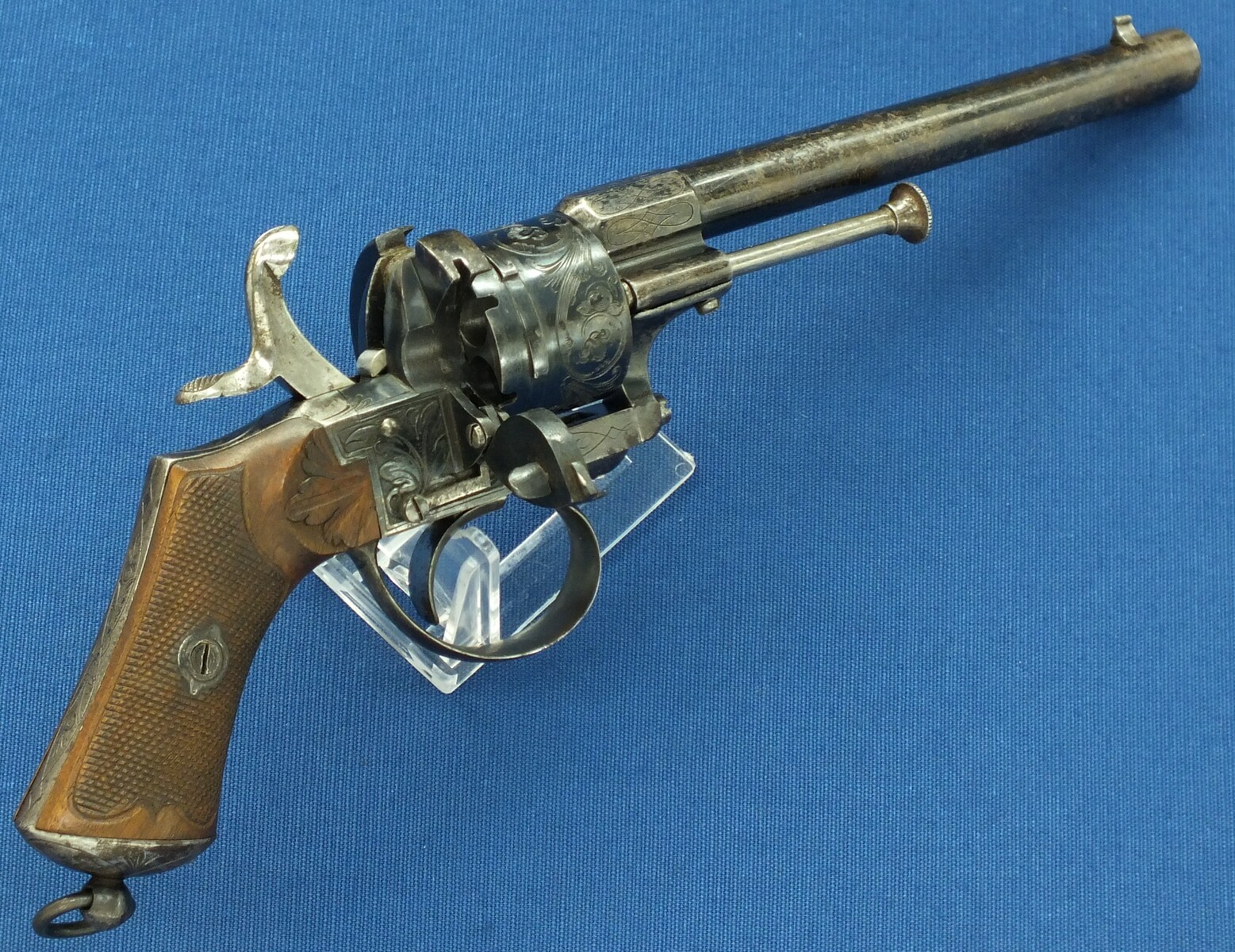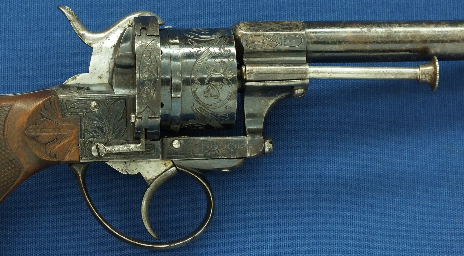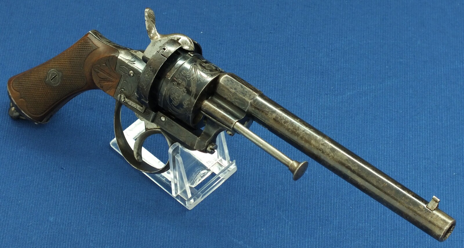 A fine antique French Floral engraved Lefaucheux type 6 shot 9mm Pinfire Revolver. Length 30cm. In very good condition. Price 950 euro.