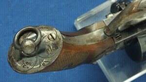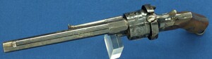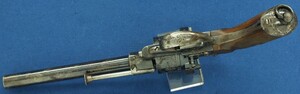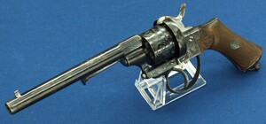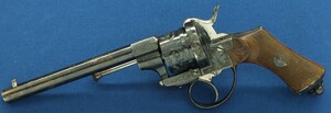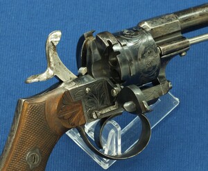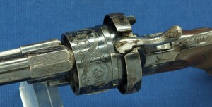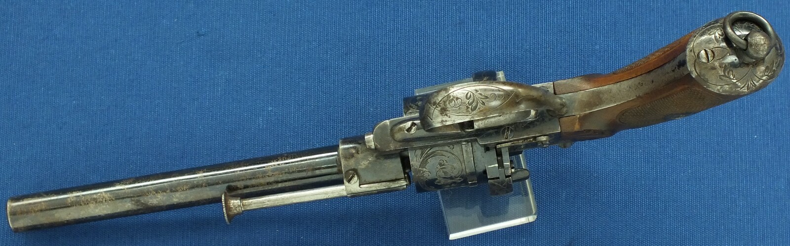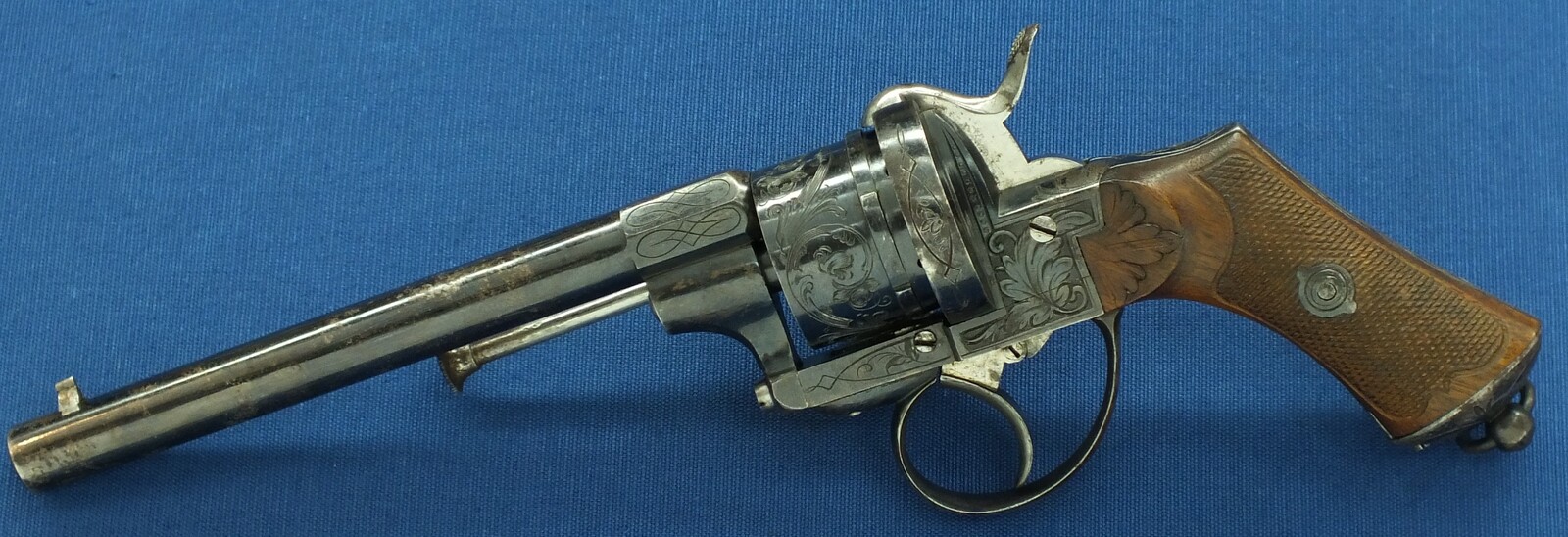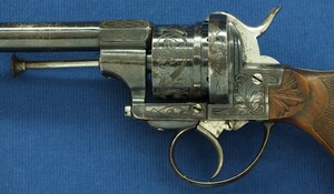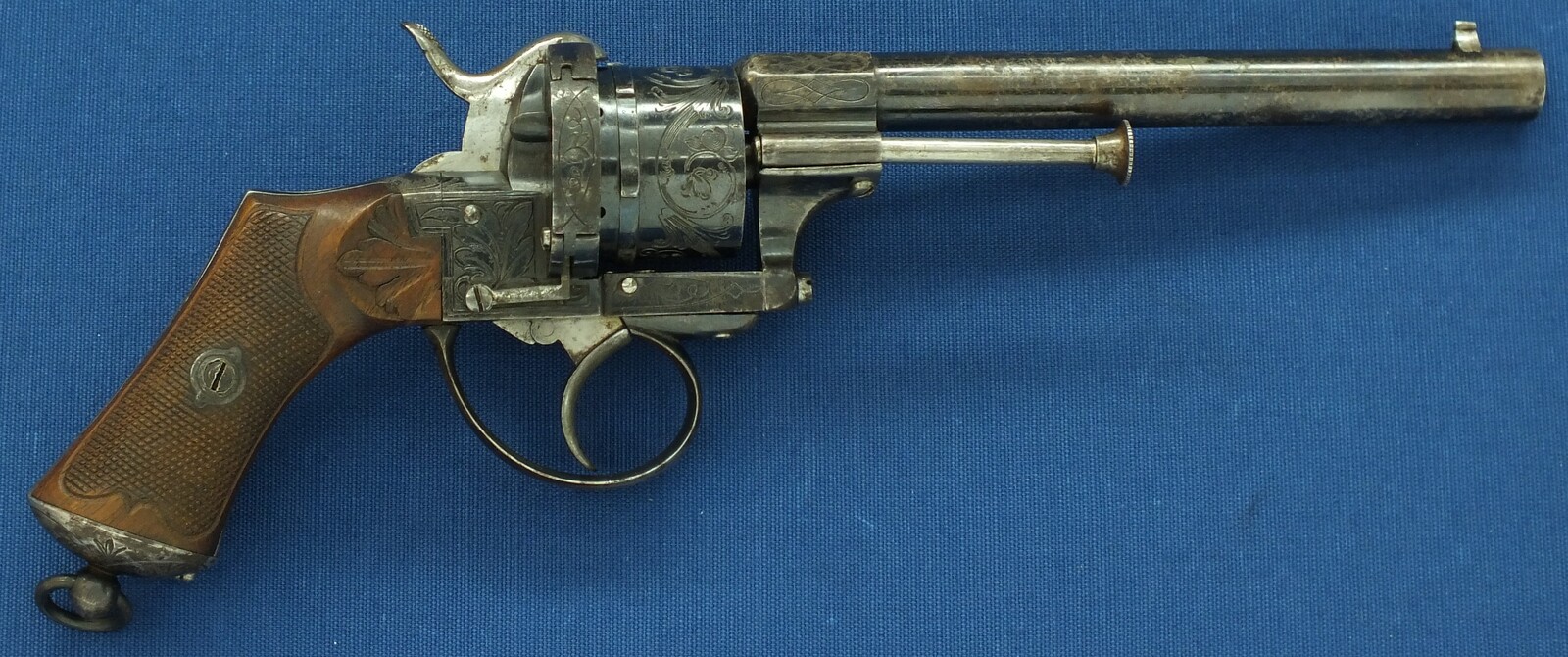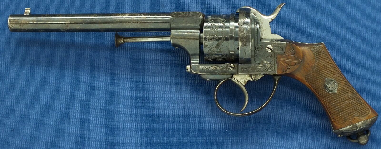 A fine antique French Floral engraved Lefaucheux type 6 shot 9mm Pinfire Revolver. Length 30cm. In very good condition. Price 950 euro.