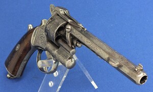 6 Shot double and single action. Special loading system. All over fine engraved. Barrel with engraved and gilded signature. Fine grips in original finish.