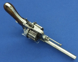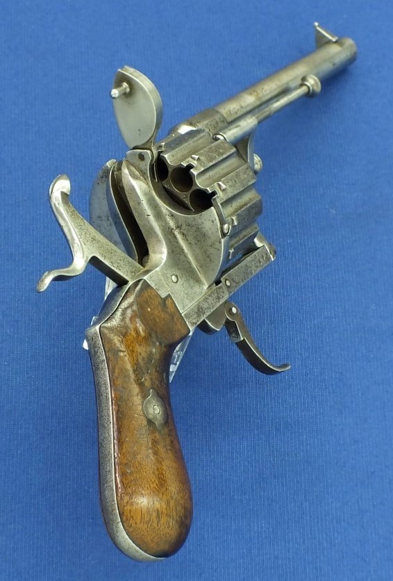 A French antique fine engraved 12 shot single and double action Pinfire Revolver with folding trigger. Caliber 9mm, length 30cm. In good condition. Price 1700,- euro