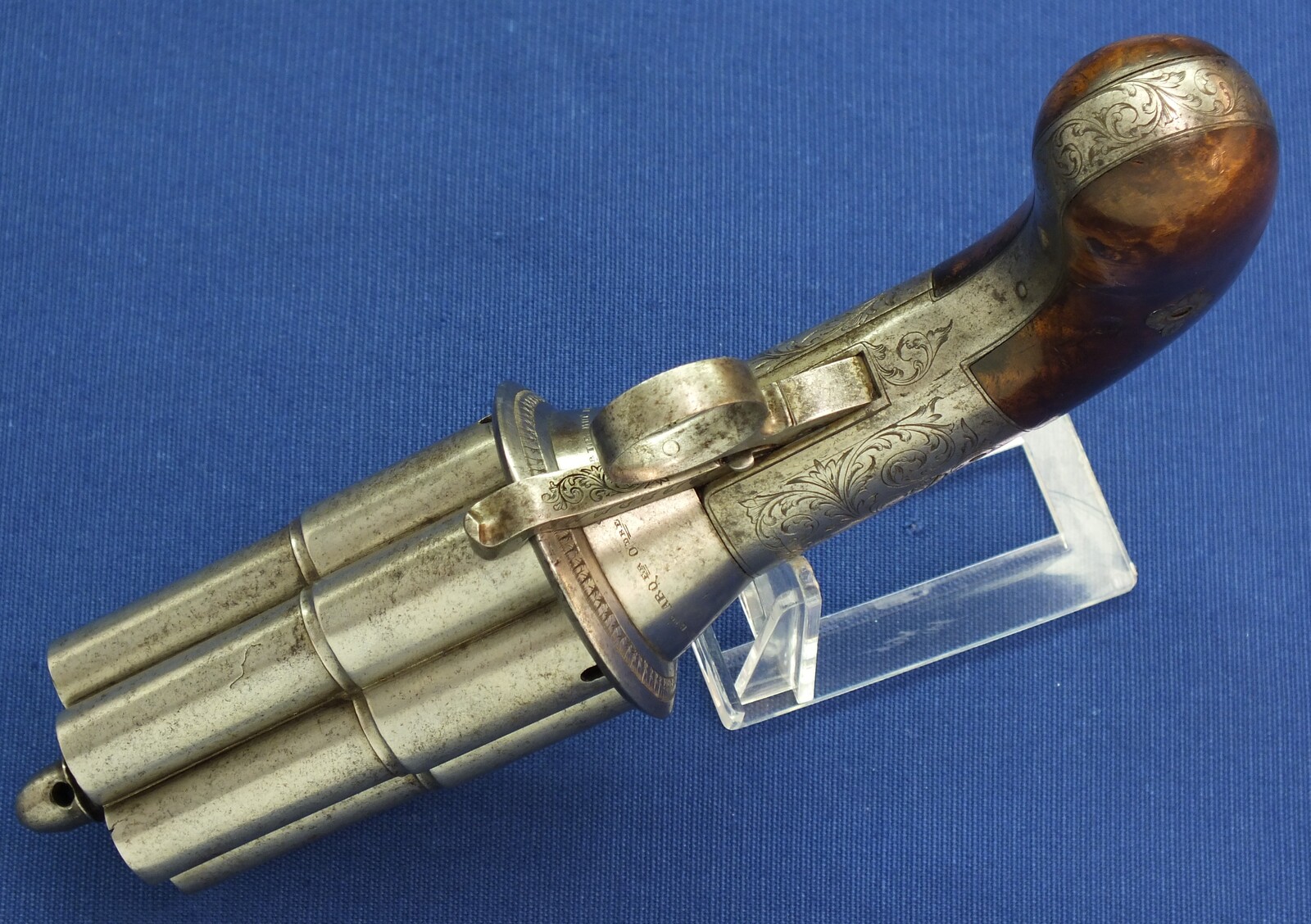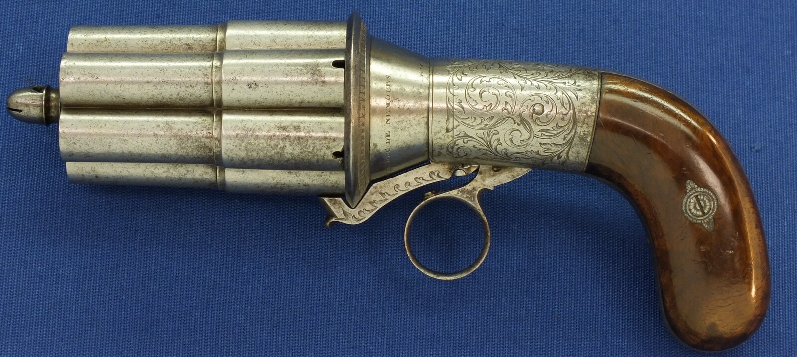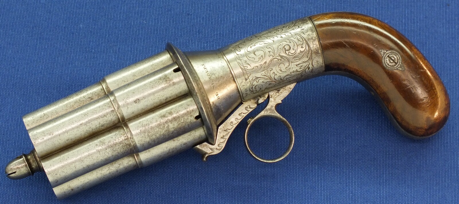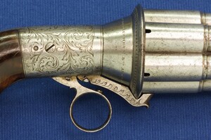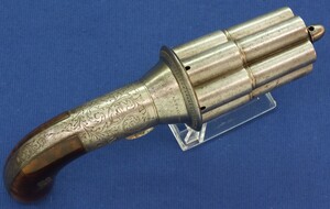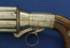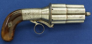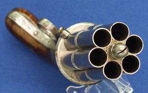 A rare fine antique engraved French Casimir Lefaucheux 6 shot 12mm Pinfire system Mariette Pepperbox. Circa 1850. Length 23cm. In very good condition.