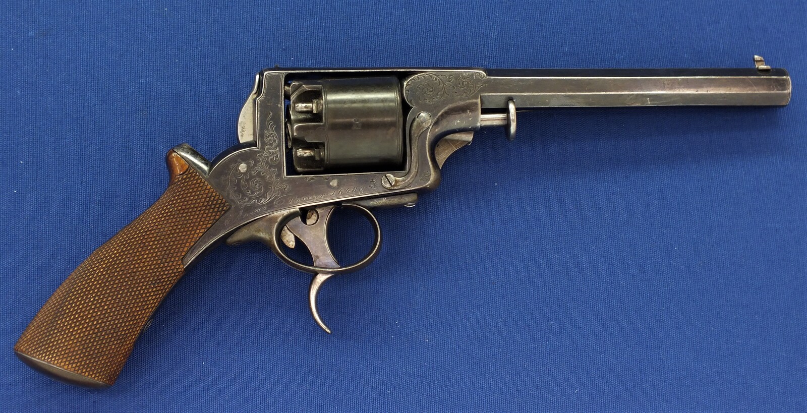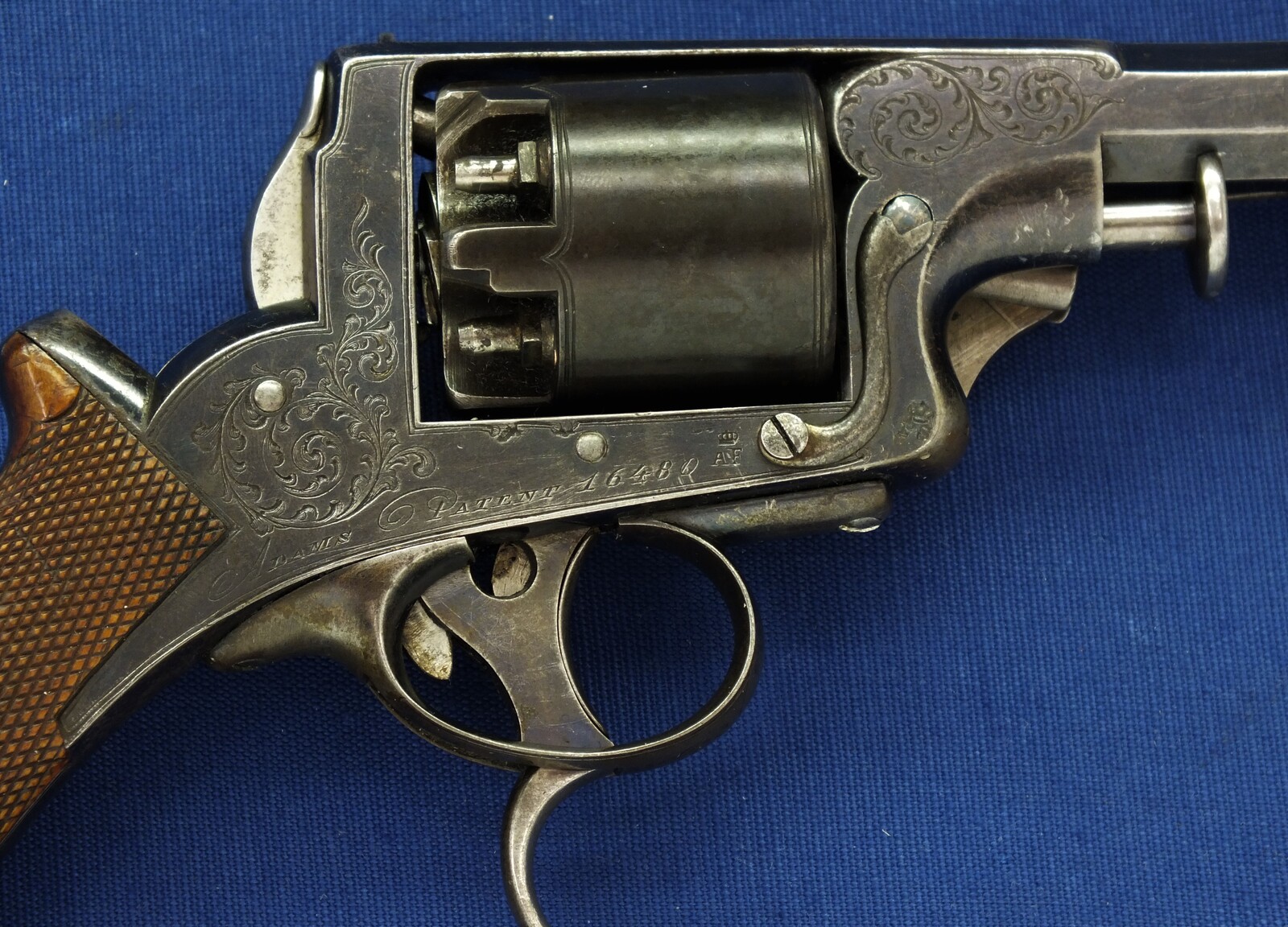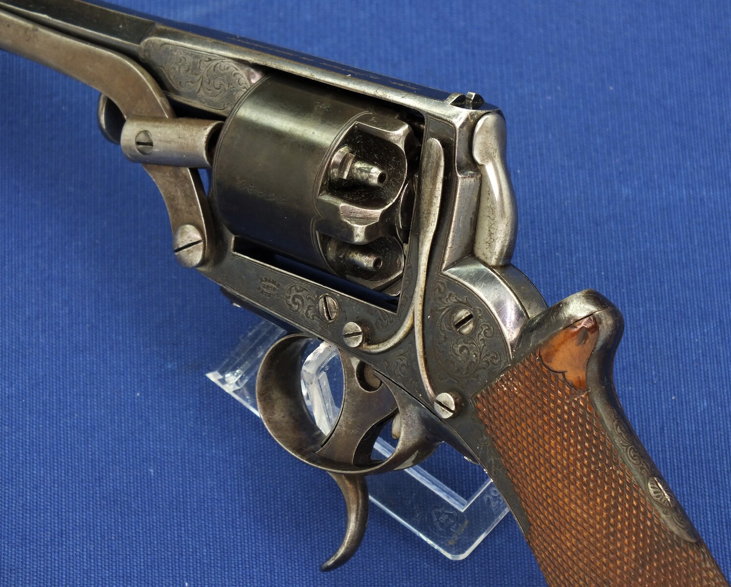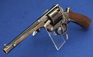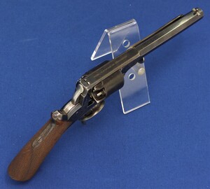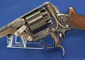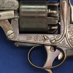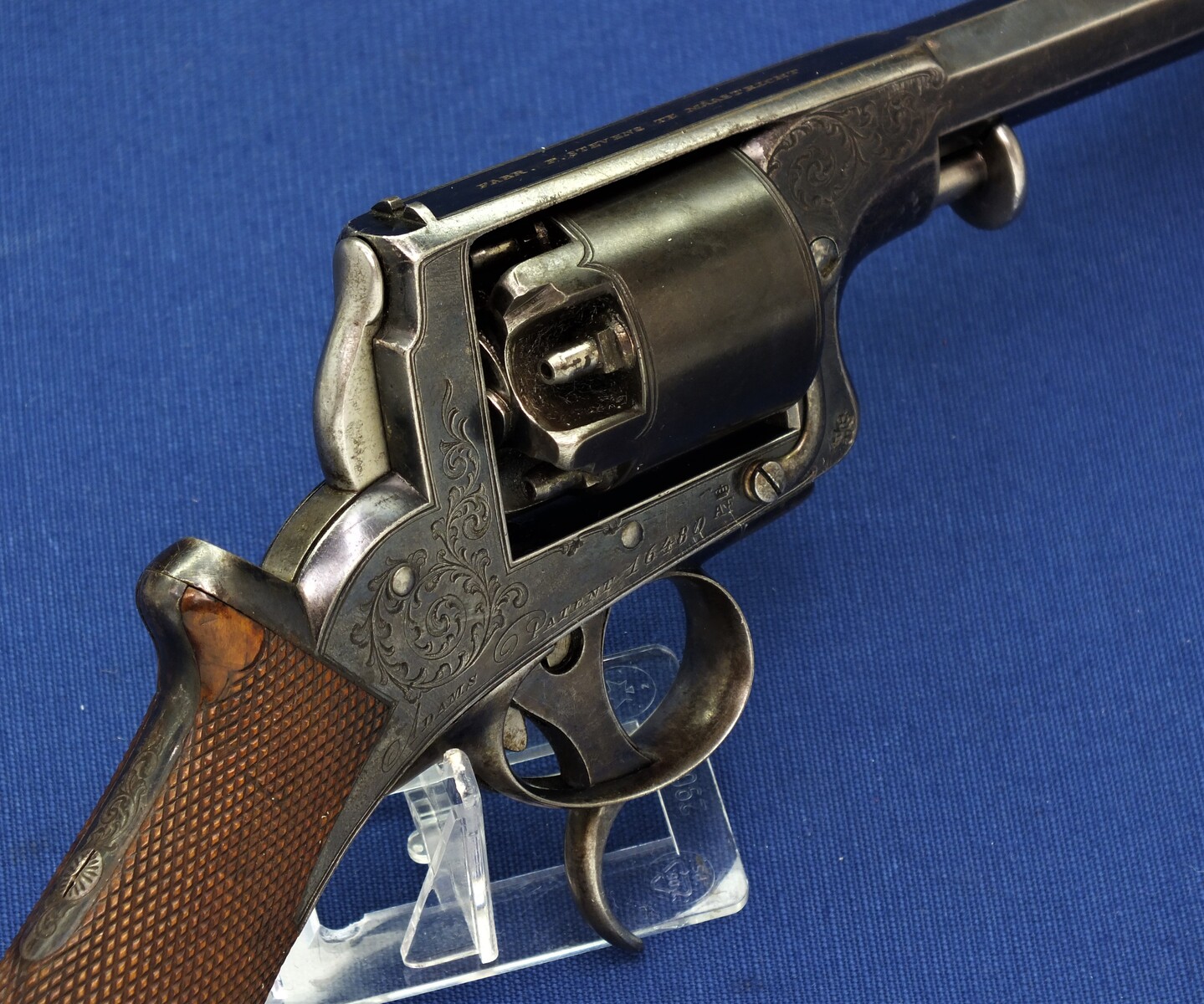 SN 16480. Special double trigger system. Lot of original blue. Fine engravings on all parts. On the barrel the signature Fabr. P. Stevens te Maastricht. On the left side of frame ADAMS 1856 PATENT and W. Tranter patent, on the right side: Adams Patent 16480, Crown over PS for P.Stevens and Crown over AF for Auguste Francotte. Signed on frame at grip A. Francotte a Liege. On the cylinder the Liege ELG proof mark and Crown over AF. Fine chequered grip in original finish.