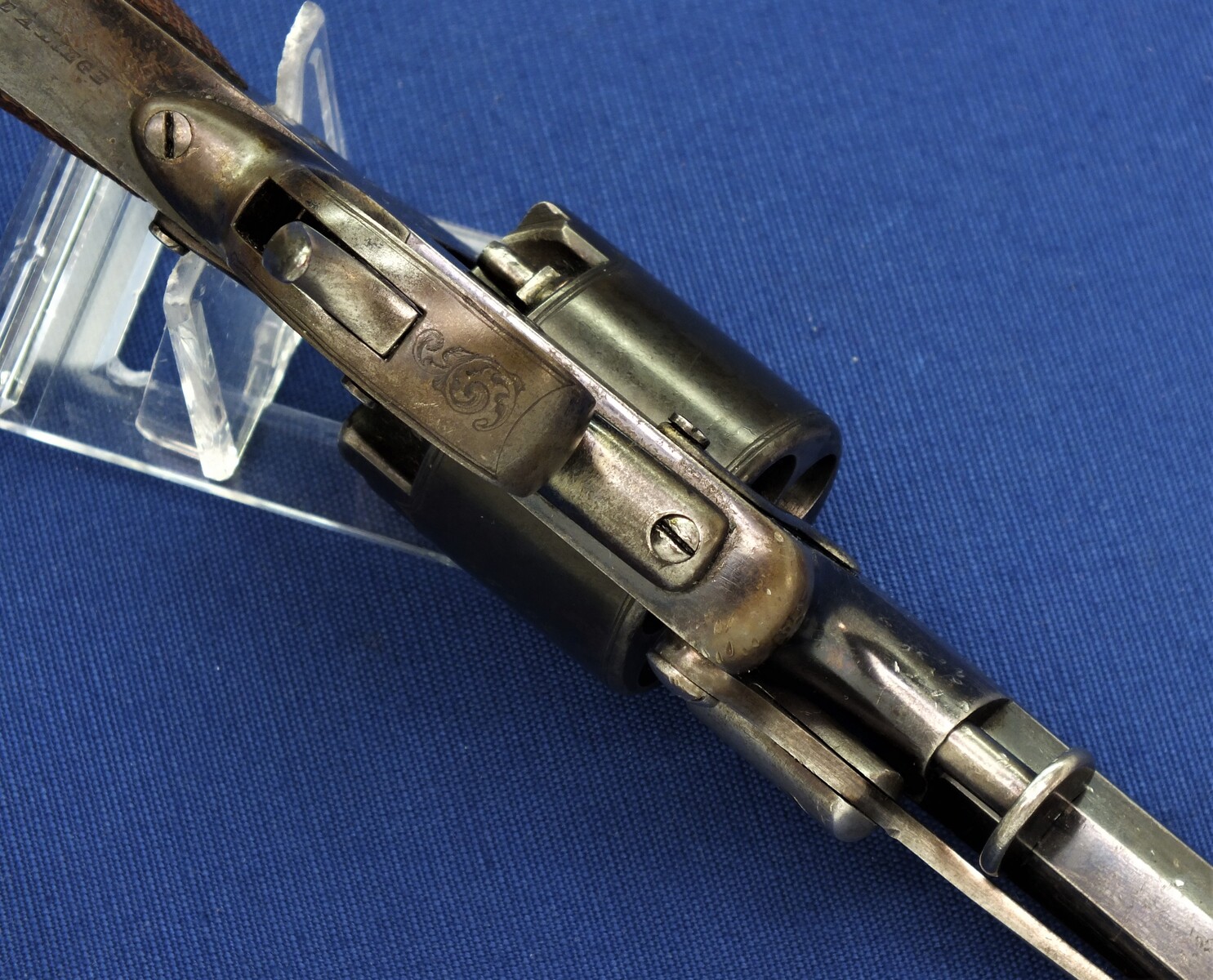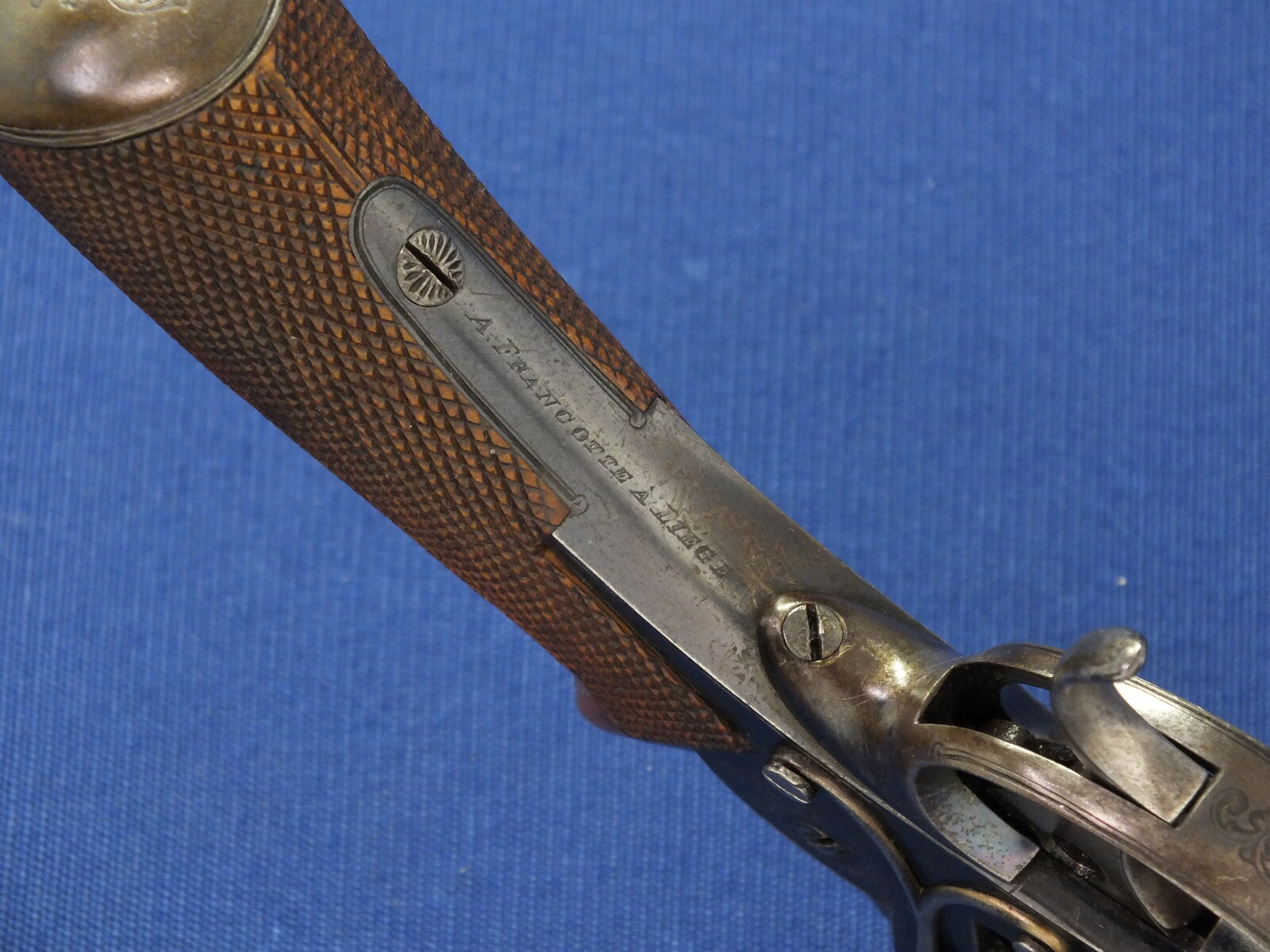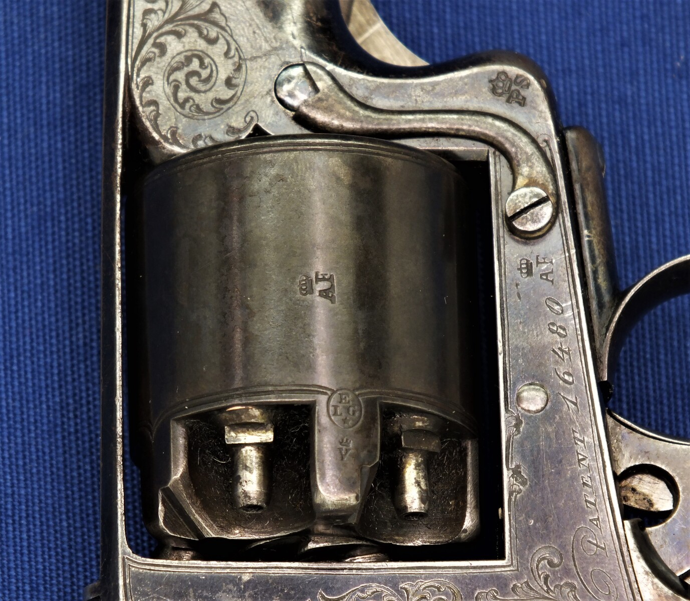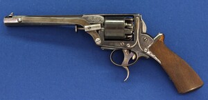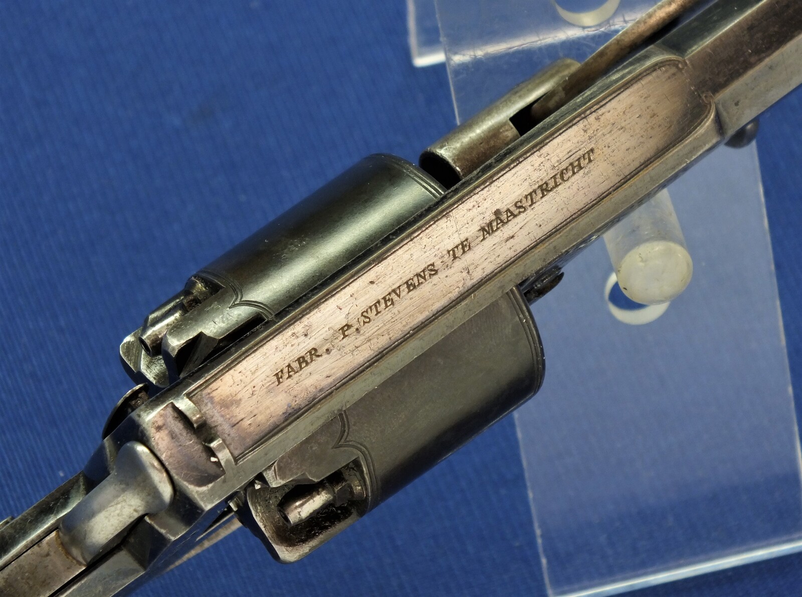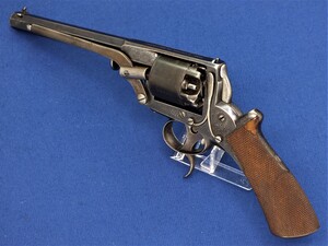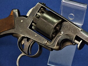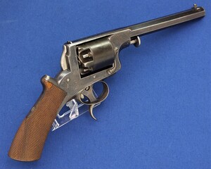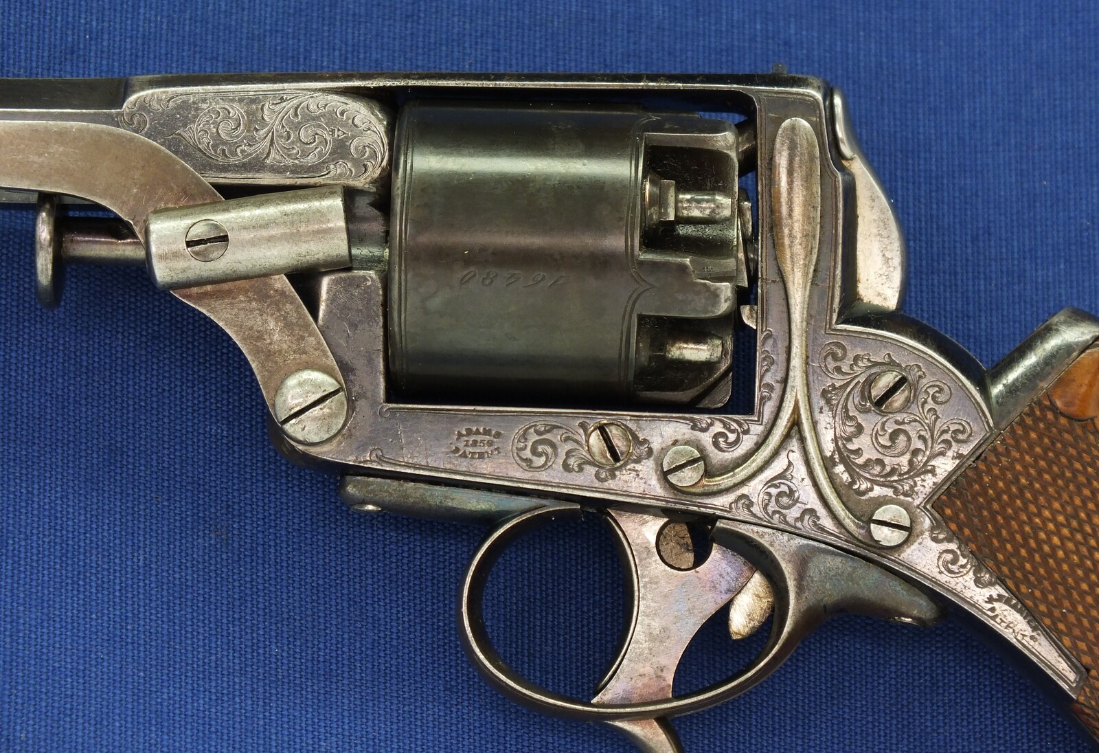 SN 16480. Special double trigger system. Lot of original blue. Fine engravings on all parts. On the barrel the signature Fabr. P. Stevens te Maastricht. On the left side of frame ADAMS 1856 PATENT and W. Tranter patent, on the right side: Adams Patent 16480, Crown over PS for P.Stevens and Crown over AF for Auguste Francotte. Signed on frame at grip A. Francotte a Liege. On the cylinder the Liege ELG proof mark and Crown over AF. Fine chequered grip in original finish.