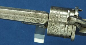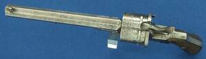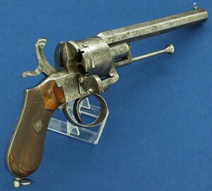 An antique Belgian/Liege engraved Lefaucheux type 6 shot single and Double-Action 12mm pinfire Revolver with rare swing out ejector Rod fixed in frame. Length 31,5cm. In good/very good condition. Price 750 euro
