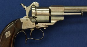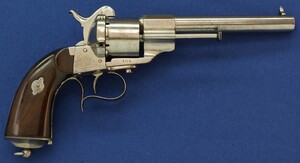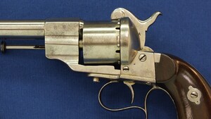 An antique French Military Lefaucheux Model 1854 6 shot 12mm Single Action Pinfire Revolver. Length 31,5cm. In very good condition. Price 1.750 euro.