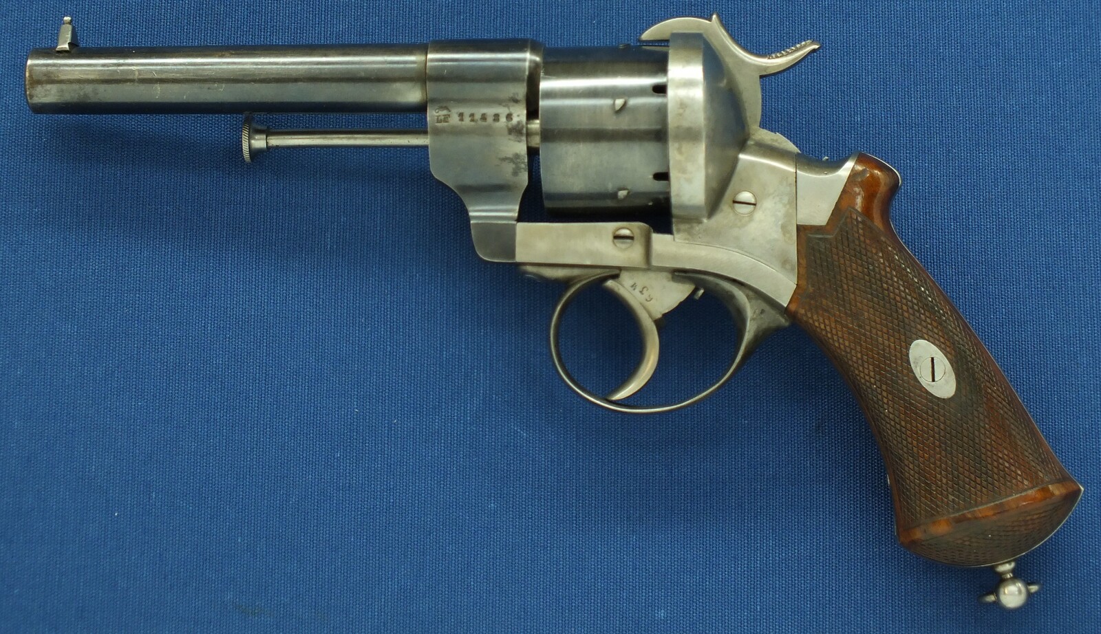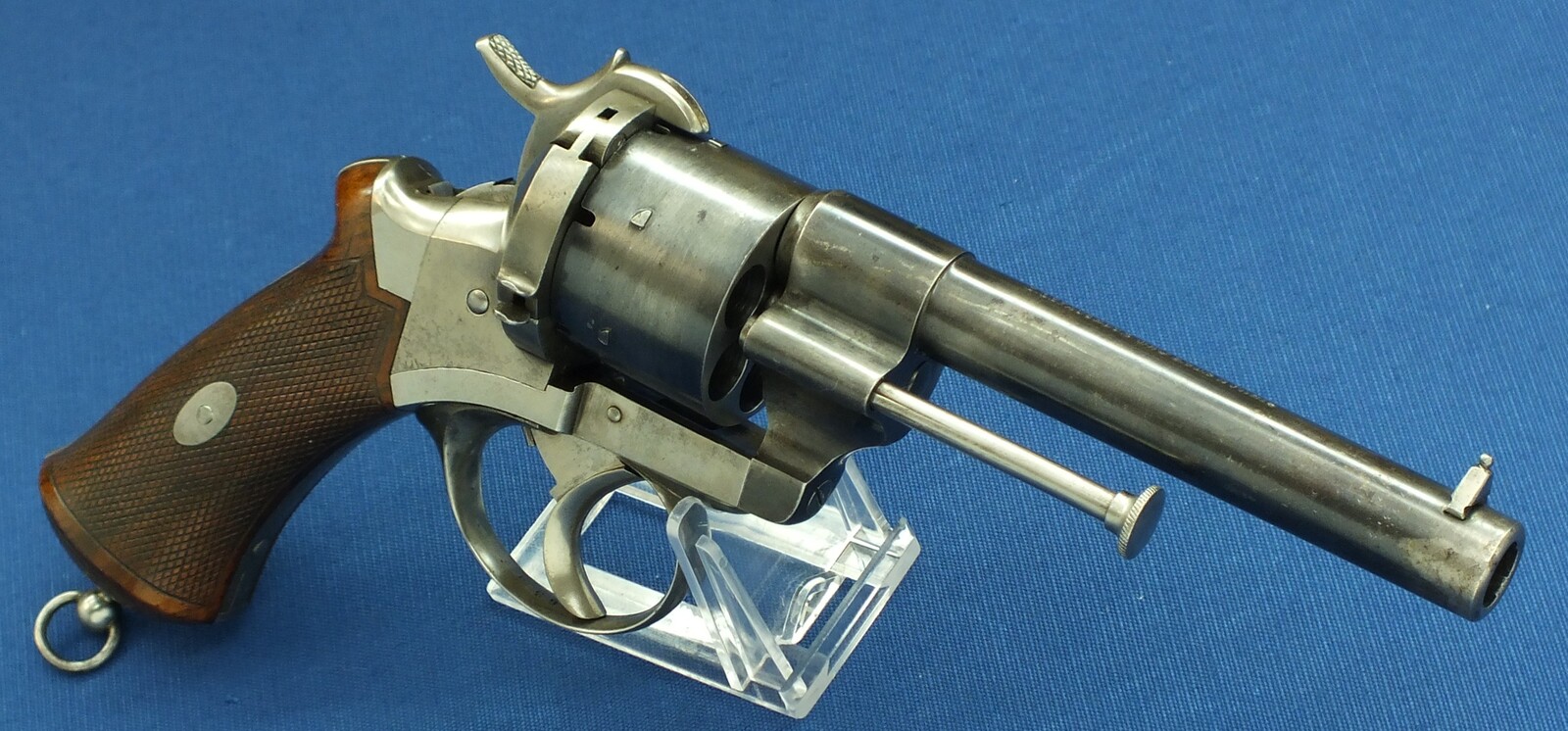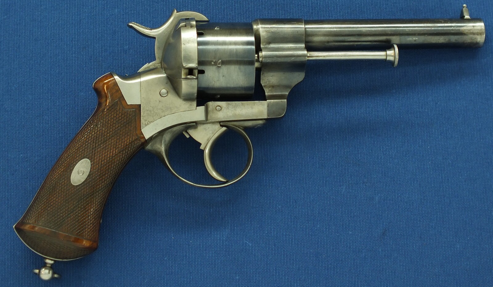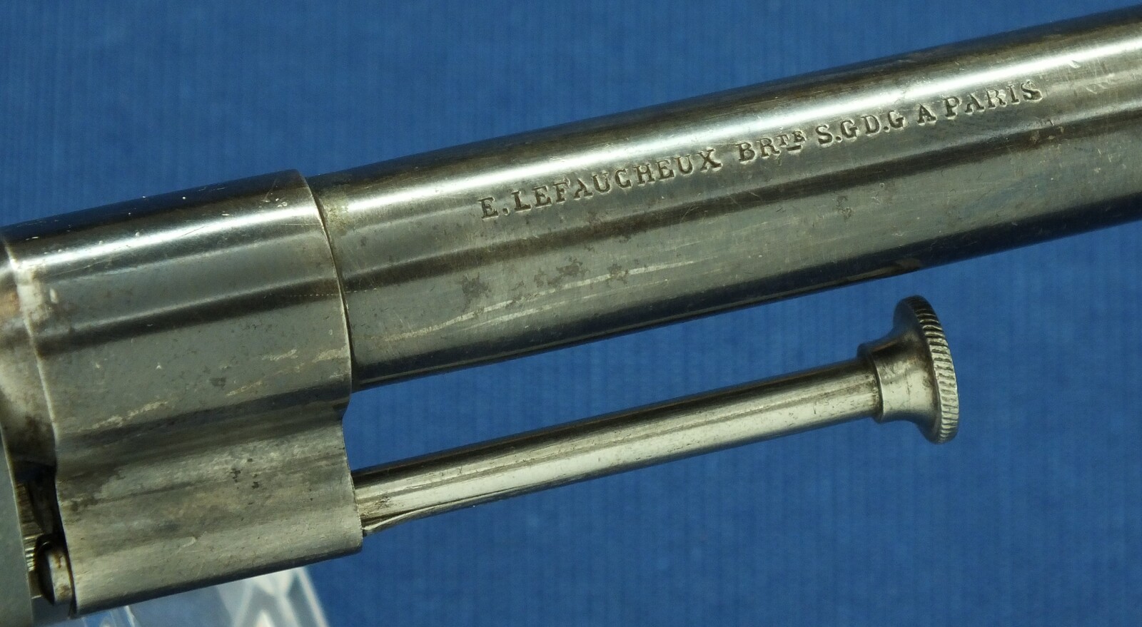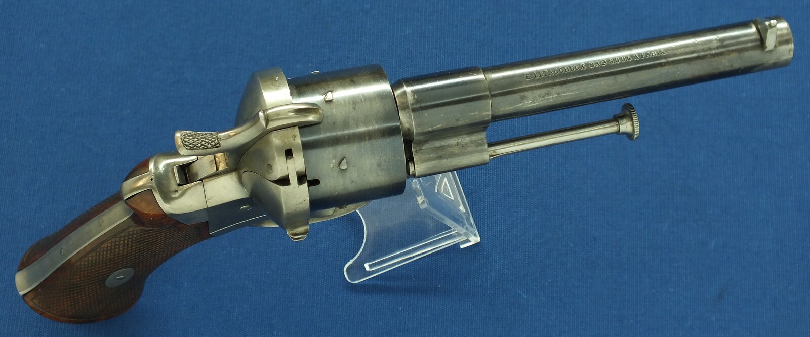 An antique French Triple Action Pinfire Revolver Lefaucheux Model 1862, signed "E.LEFAUXEUX BRTE S.G.D.G. A PARIS", caliber 12 mm, 6 shot, length 28.5 cm, in very good condition. Price 1.500 euro