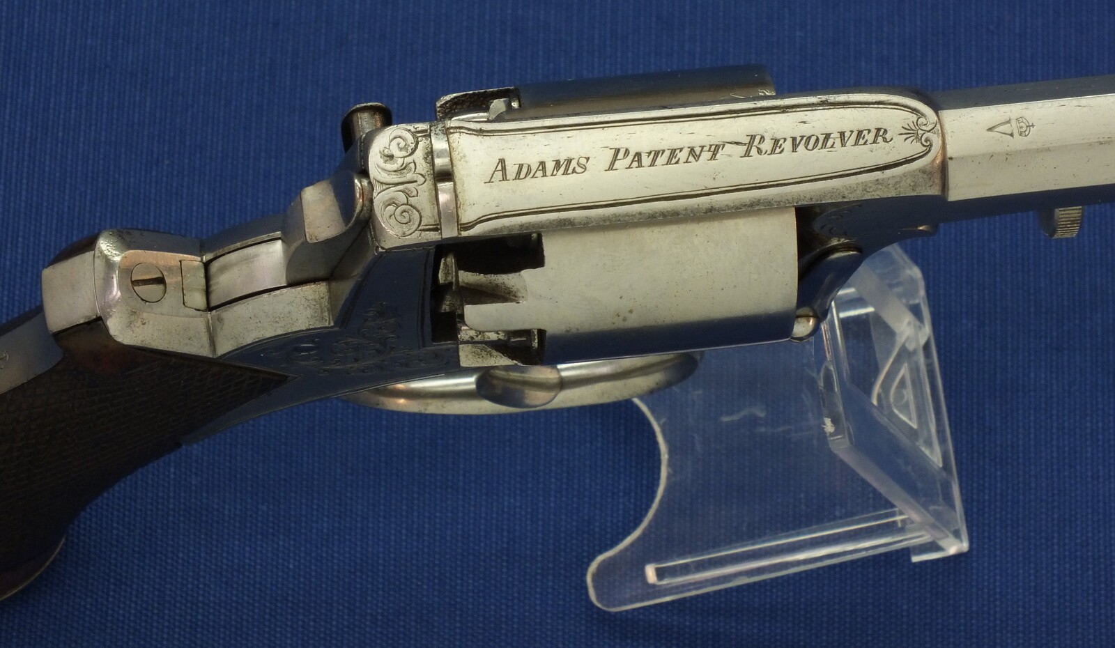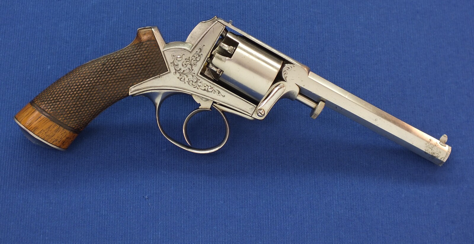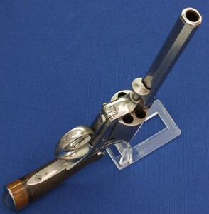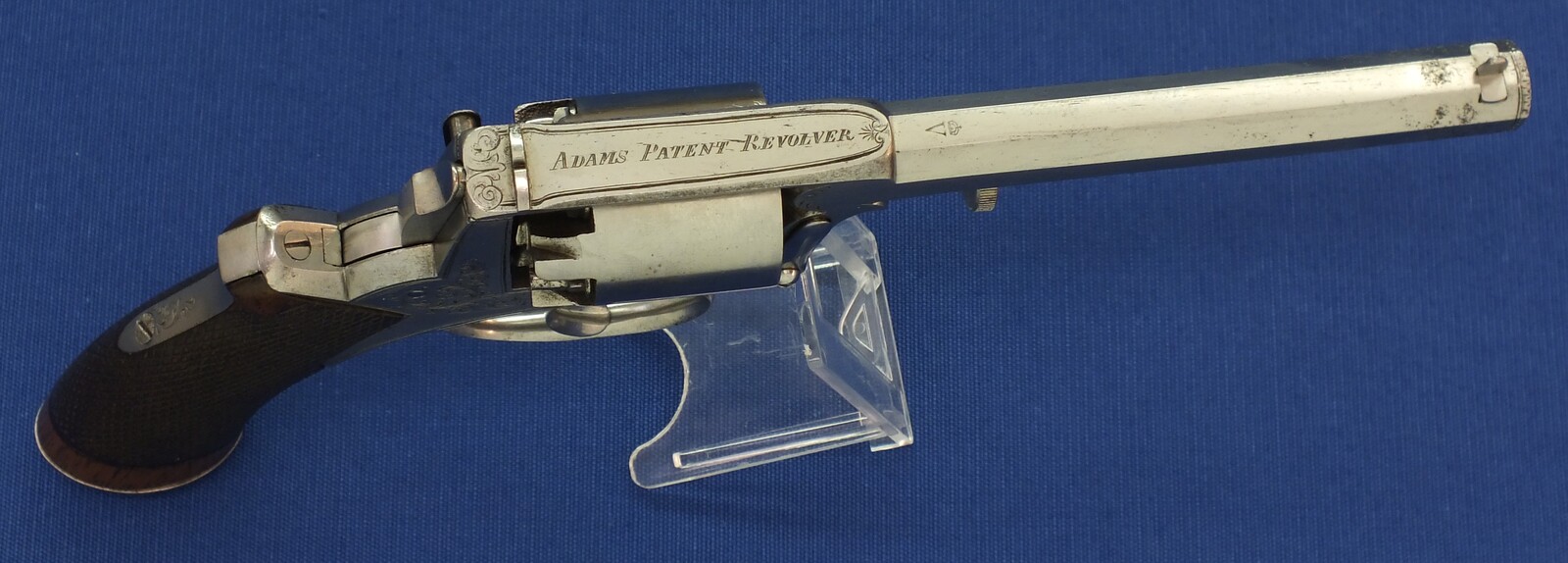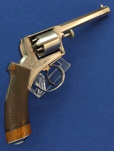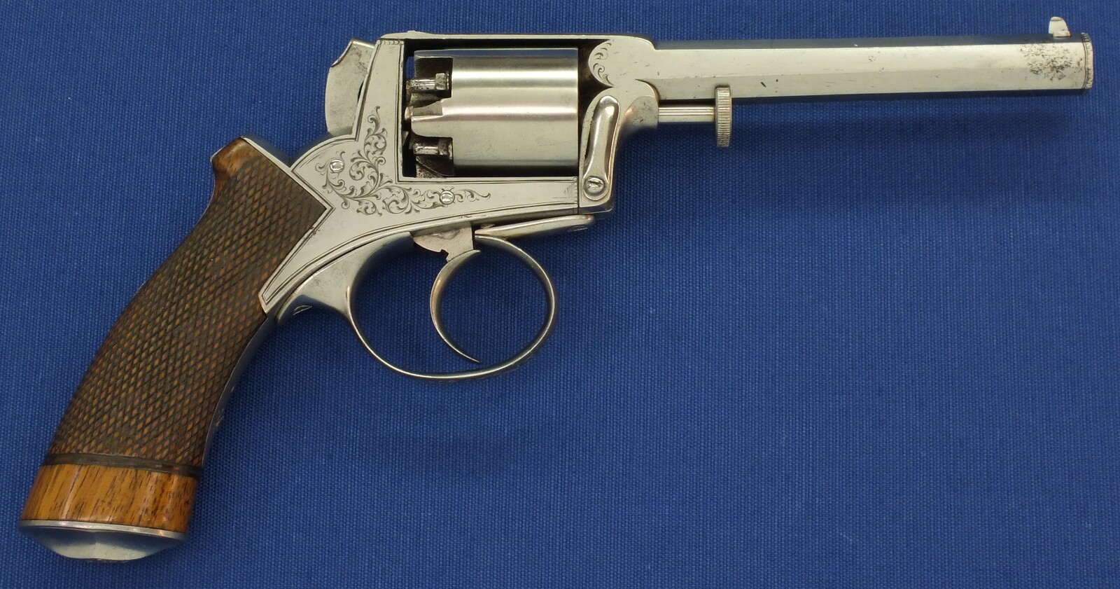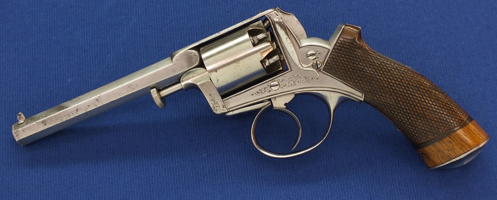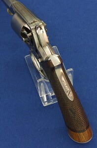 Fine chequered Walnut grip. Signed on top: ADAM'S PATENT REVOLVER. German proofmarks on barrel and cylinder.