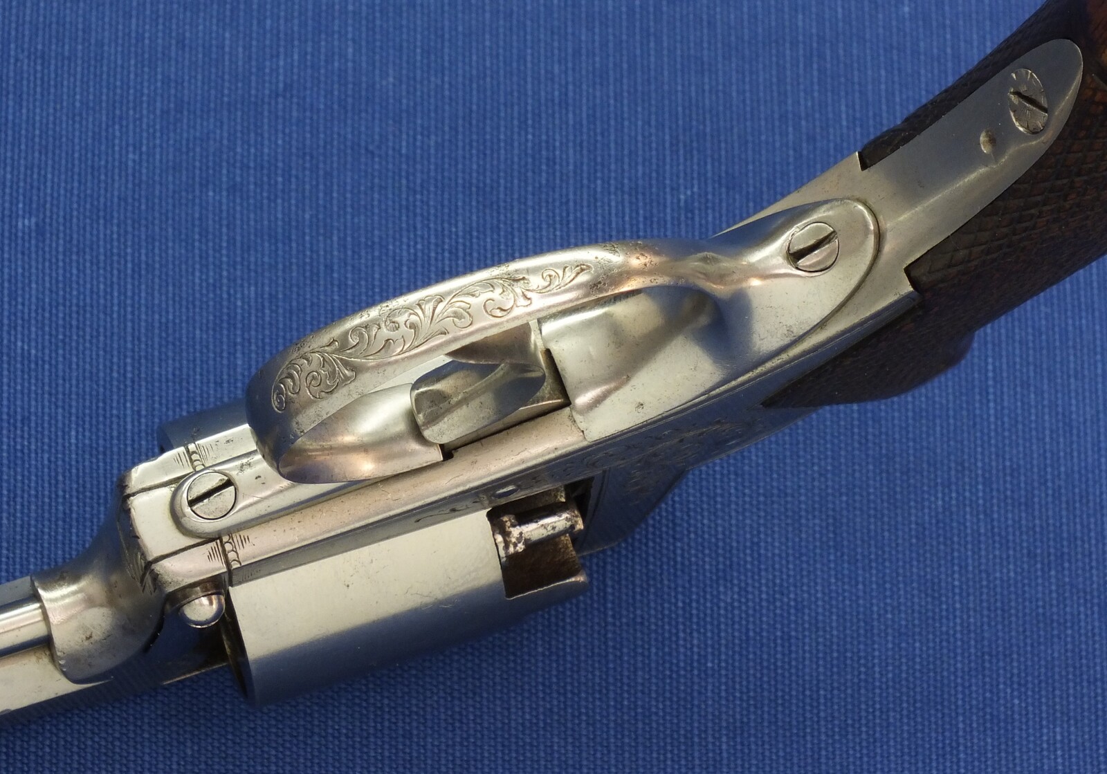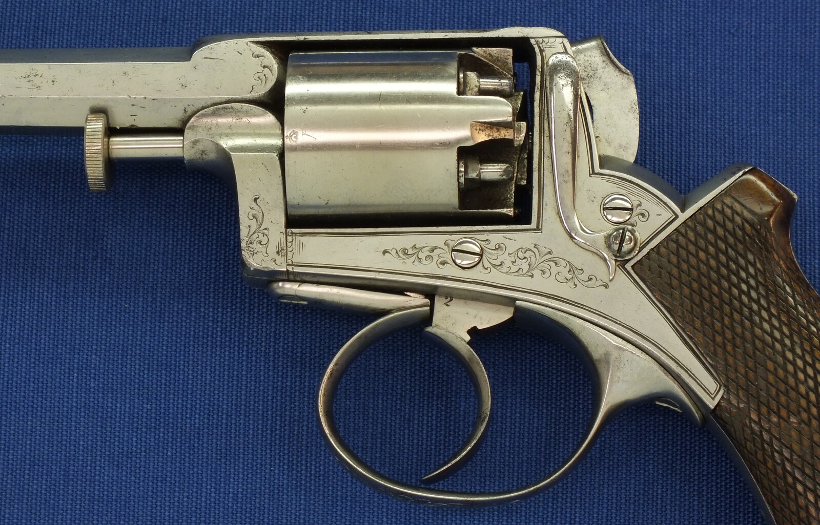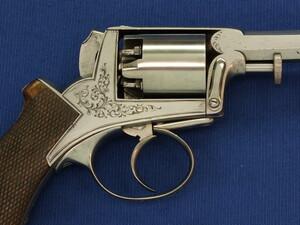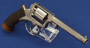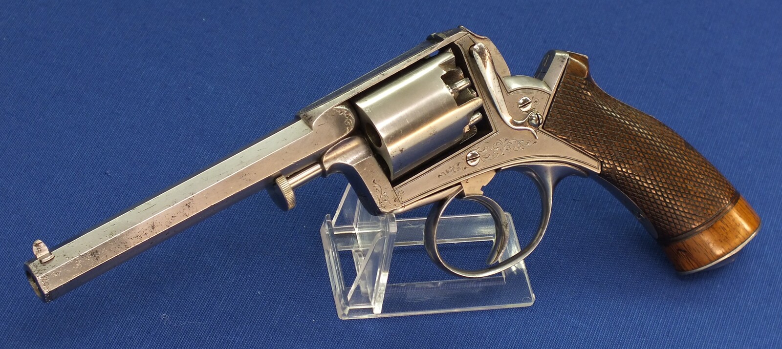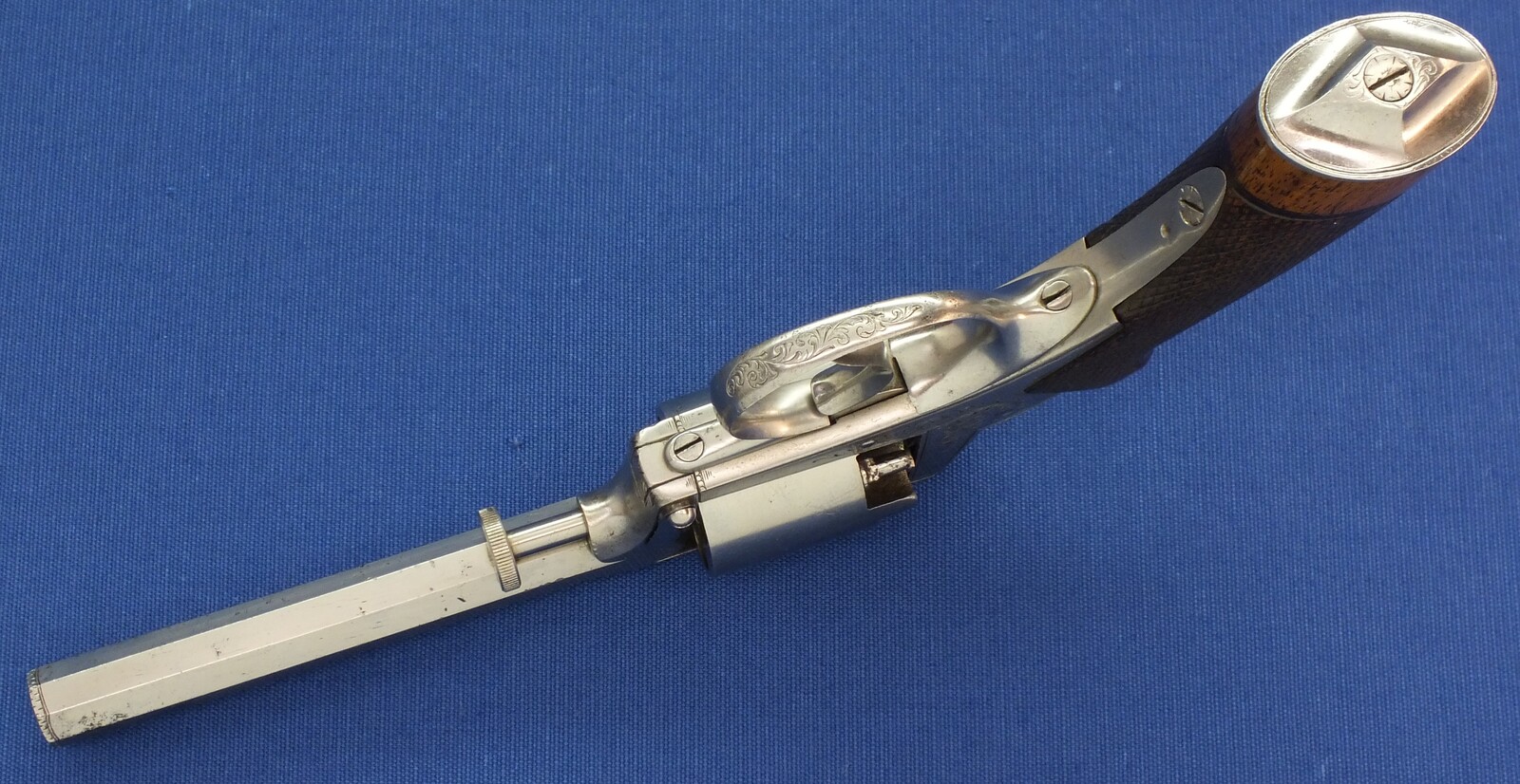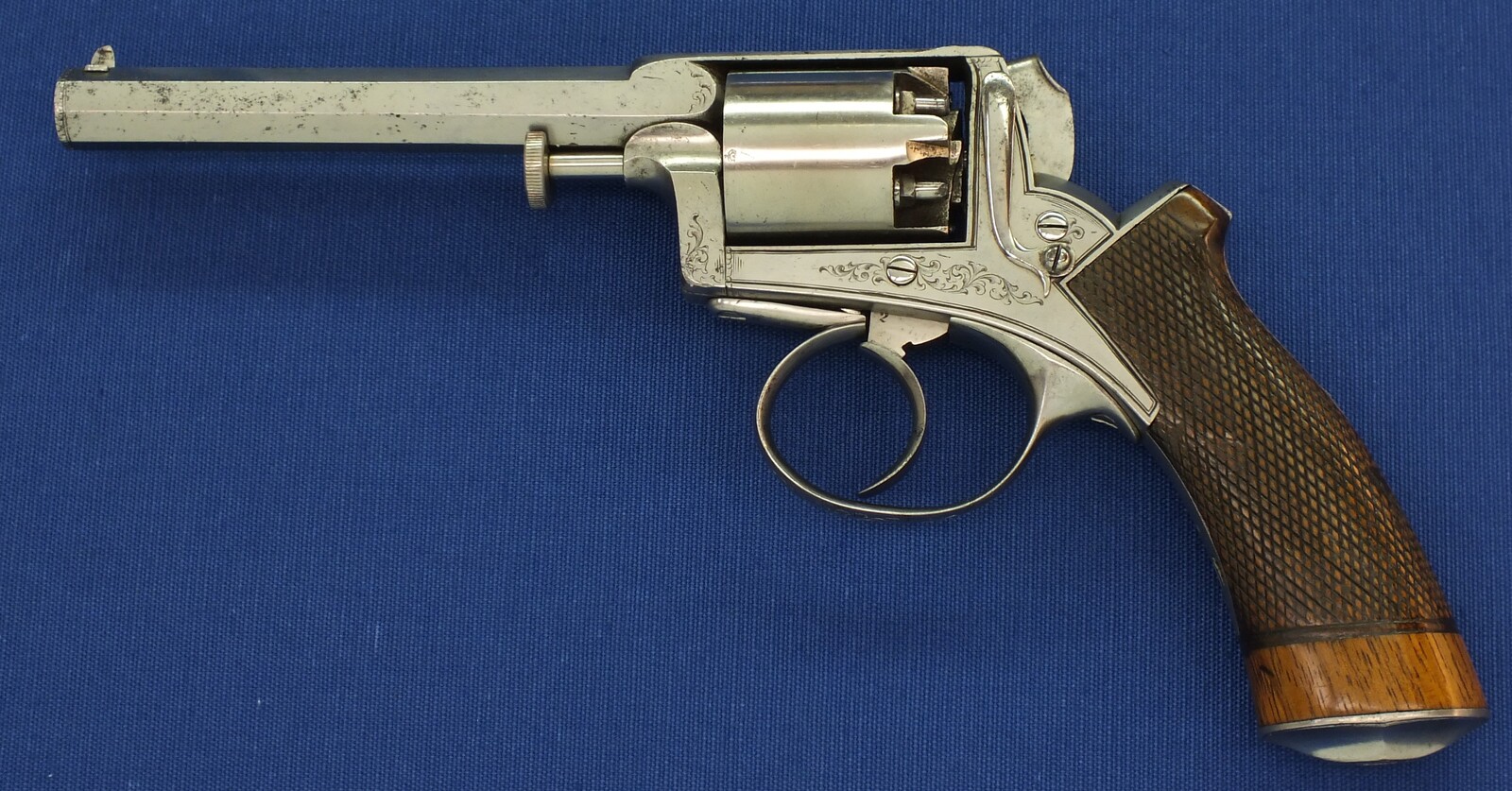 Fine chequered Walnut grip. Signed on top: ADAM'S PATENT REVOLVER. German proofmarks on barrel and cylinder.