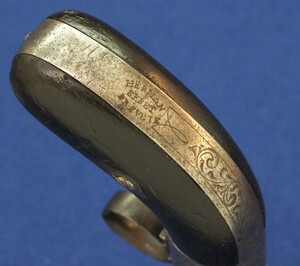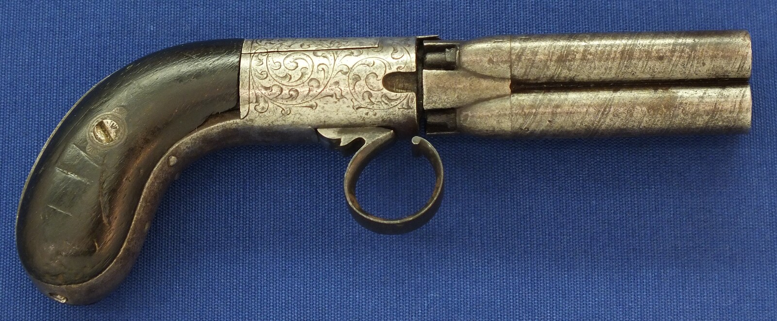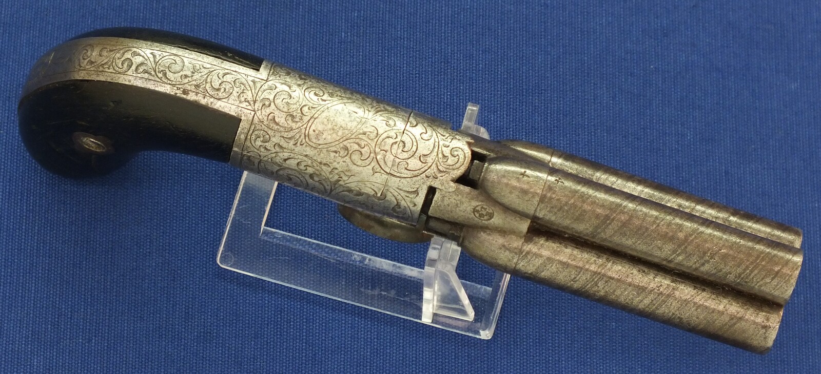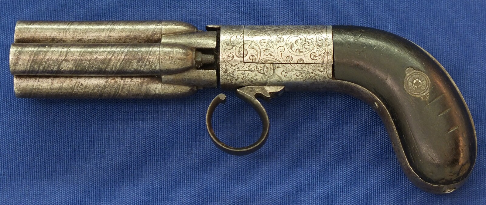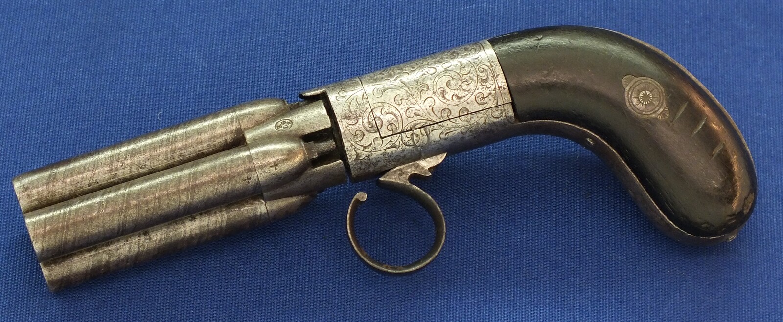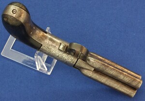 An unrestored rare HERMAN SERET BREVETE 4 shot Percussion Pepperbox with internal Hammer. 9,5mm Caliber. 3 inch barrels. Length 19,5cm. In fair condition.