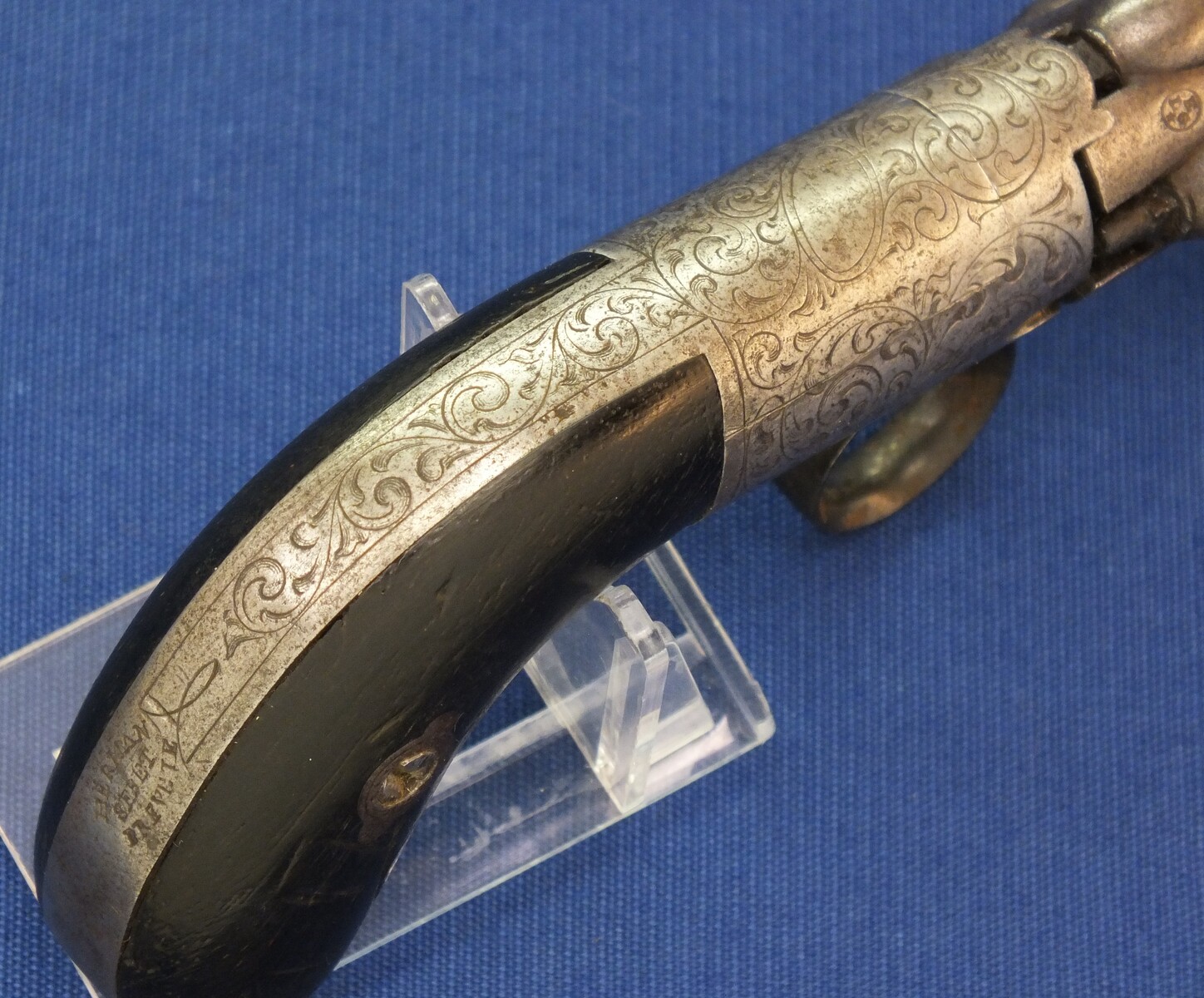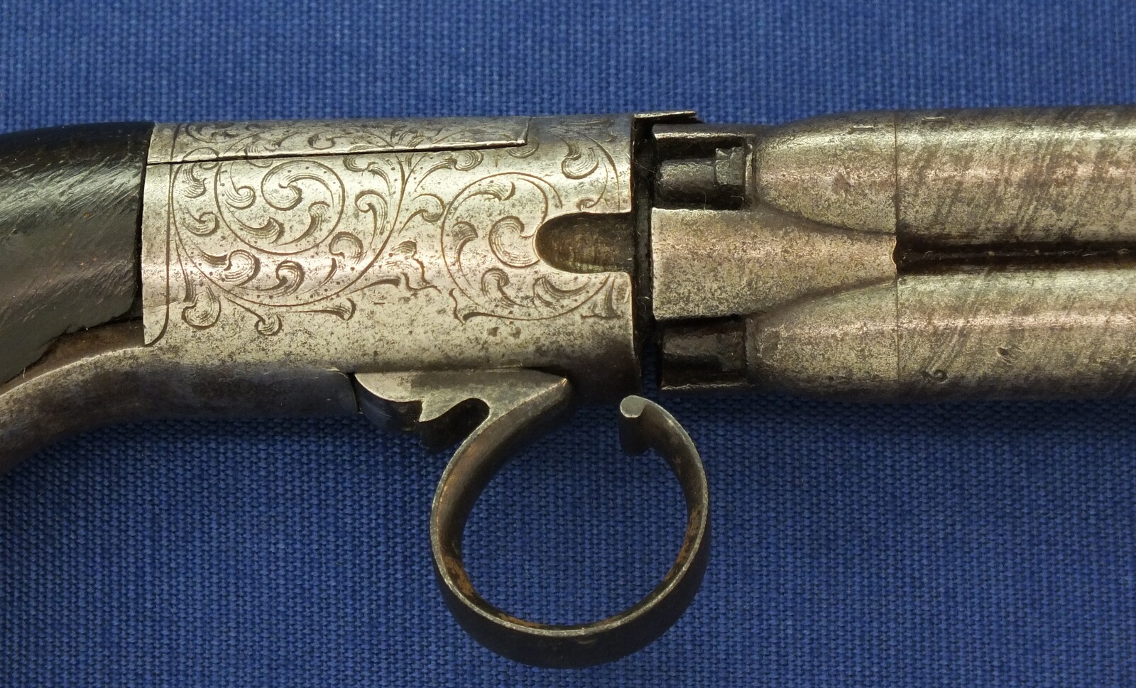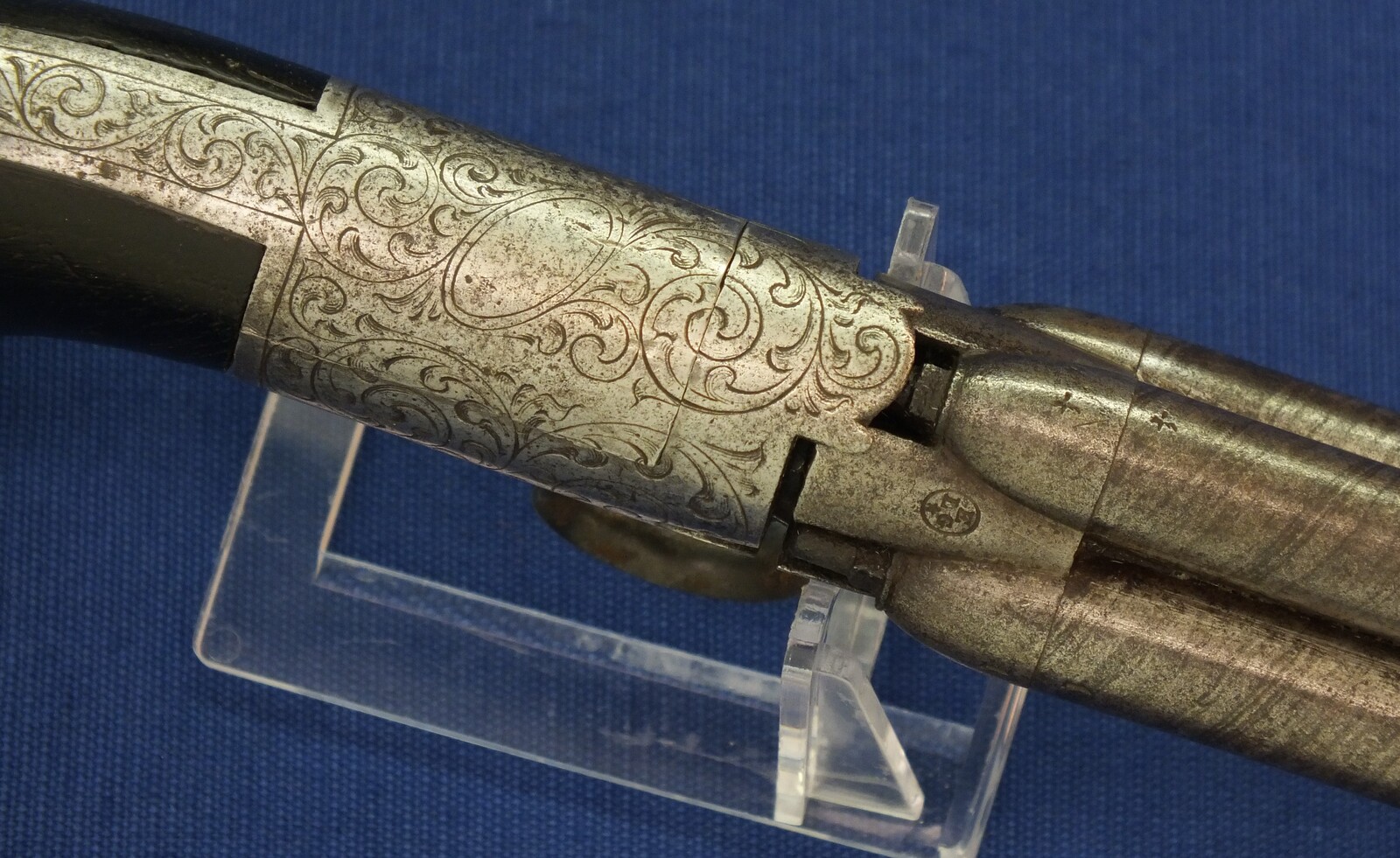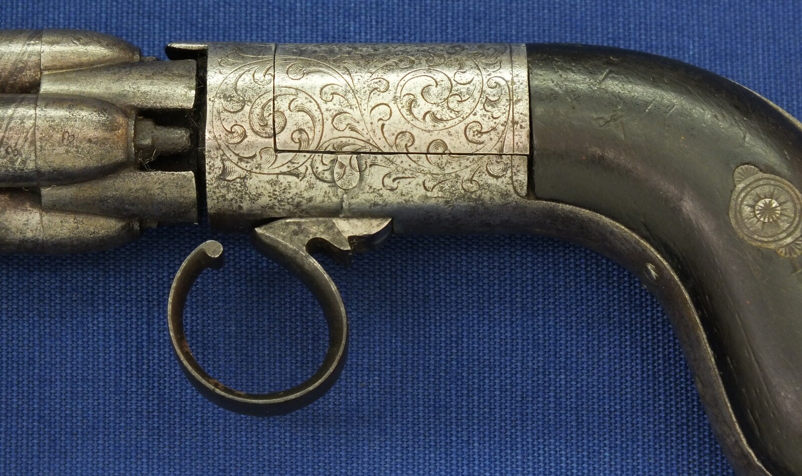 An unrestored rare HERMAN SERET BREVETE 4 shot Percussion Pepperbox with internal Hammer. 9,5mm Caliber. 3 inch barrels. Length 19,5cm. In fair condition.