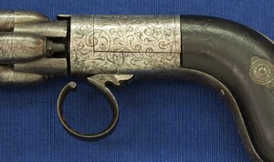 An unrestored rare HERMAN SERET BREVETE 4 shot Percussion Pepperbox with internal Hammer. 9,5mm Caliber. 3 inch barrels. Length 19,5cm. In fair condition. Price 395 euro.