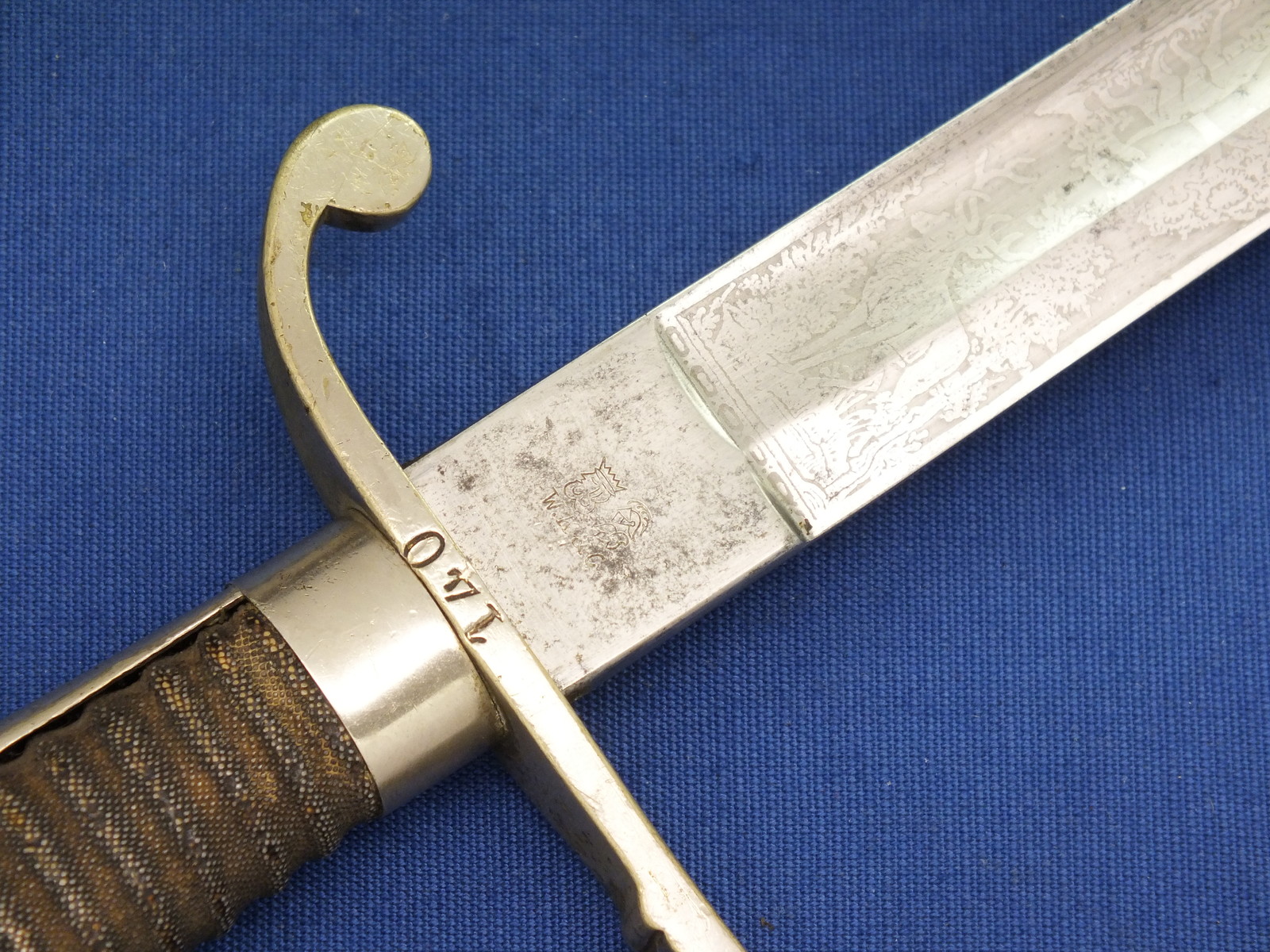 Etched blade with hunting scene's. SN 140 matching numbered Leather scabbard. Fine rayskin grip